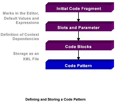 Pattern definition begins with calling PBE on the basis of an initial code fragment. In the language-specific implementations of the pattern definition, optional and repeatable code blocks are defined. Finally, the defined pattern is stored as an XML file with the pattern name as the respective file name. Individual patterns can be exchanged between several PBE installations.