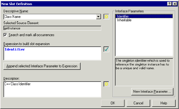 Individual code sections are marked as so-called "Slots" (context menu / Mark Slot) in the selected implementation. They represent a variety of elements in the coding of the implementation and are implementation-specific. In addition to a name and a descriptive text, a slot contains an expression to define its content.