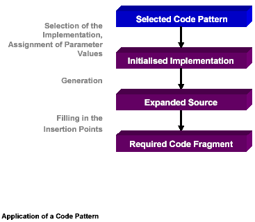 The application of a pattern begins with the selection of a stored pattern. Switching to Pattern Expansion mode can be achieved by selecting File/Subject/Pattern Expansion option. After selecting the required implementation from the Implementation combo box, it becomes possible to allocate the parameter values. After generating the required target source, one can store the parameterization data in a configuration file.