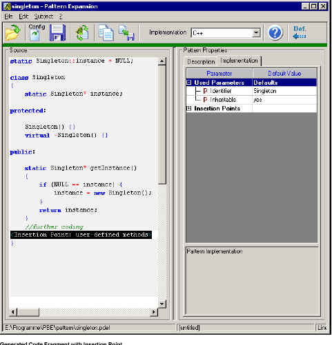 The generation of the required target source will be initialized via the Expand Pattern button. The generated target source will be displayed in the source window.