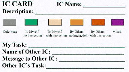 IC Cards were developed by S. K. Chang as a framework for developing interactive multimedia applications. IC (Index Cell) Card is similar to cue-card that describes an object in a design. This card serves as an information template for an object. It features the description of the object, its name, its task, and its interactions with other objects. In the domain of multimedia software design, each IC Card represents a multimedia object. In the domain of patterns, each IC Card can represent a class or an object.