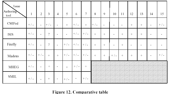 The work is summarized in the table of Figure 12 where a comparison of the different systems according to the different issues (1 to 15) is done. The fifteen issues, identified throughout this work, are recalled below:
