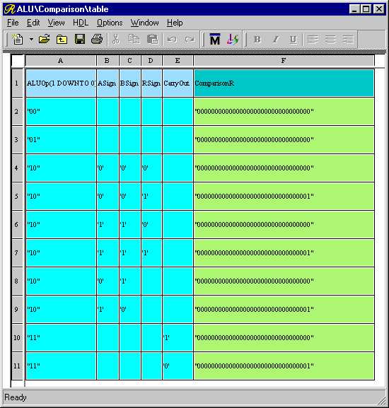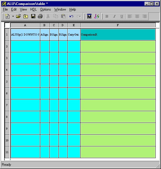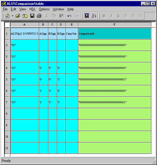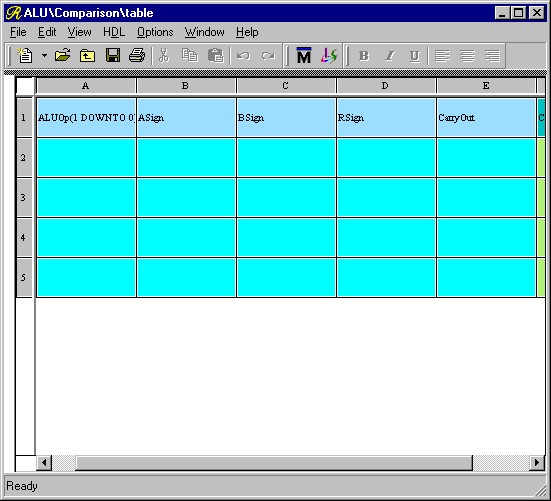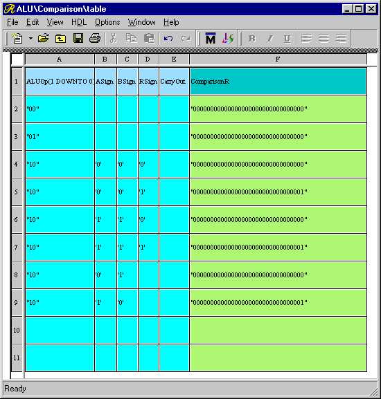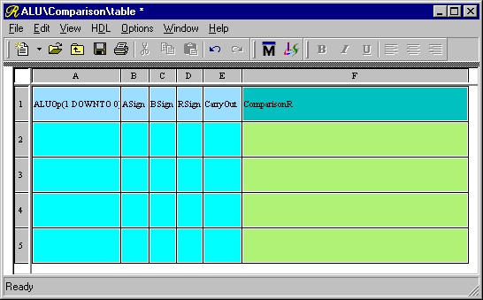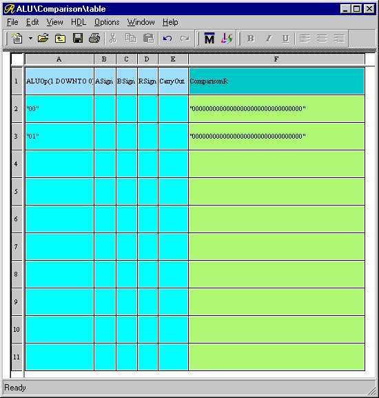 You may resize the rows and columns of the Truth Table by moving the pointer over the lines separating the row and column headers (which are in gray), left-clicking, and dragging to the desired height or width just like in a spreadsheet program. Resize the ASign, BSign, RSign, and CarryOut columns so that the signal names just fit. Now make the ComparisonR column much larger because it will be holding a 32-bit wide vector. Your view should look something like Figure 2.