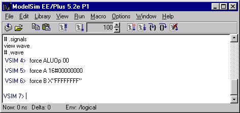 The command in ModelSim to stimulate a signal is called force. For our first timestep, we wish to set the ALUOp to "00", so we type force ALUOp 00 at the VSIM prompt and hit return. The main window will now look like Figure 9. Constant strings of bits can simply be represented by a sequence of ones and zeros.