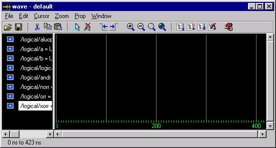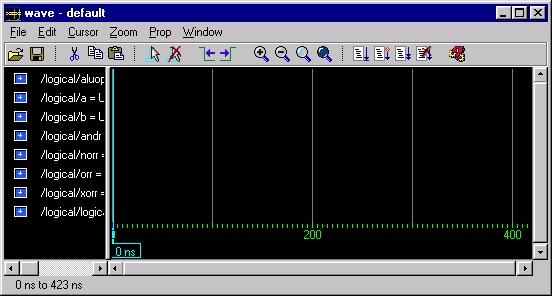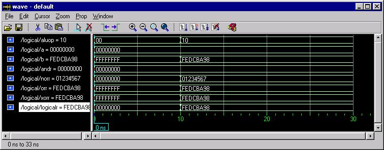 -- First set A and B to zero and the ALUOp to NOR (11). -- Check that NORR and LogicalR are both "FFFFFFFF" and -- that ANDR, ORR, and XORR are all "00000000". This -- will verify one test case for each individual logic -- operation and will verify that the "11" select of the -- multiplexor is working. force ALUOp 11 force A X"00000000" force B X"00000000" run 10 -- Now leave A as zero, set B to "FFFF0000" and set the -- ALUOp to 00. Check that ANDR and LogicalR are -- both "00000000". Since ANDR is the only intermediate -- result that should be zero, if LogicalR is also -- zero, then the multiplexor should be working for "00" -- on the select. ORR and XORR should be "FFFF0000" and -- NORR should be "0000FFFF". force ALUOP 00 force A X"00000000" force B X"FFFF0000" run 10 -- Now we will set A to "FFFFFFFF" and B to "F0F0F0F0". -- This will give a unique answer for ORR of "FFFFFFFF" -- so we will set ALUOp to "01". Check that ORR and -- LogicalR are "FFFFFFFF". ANDR should be "F0F0F0F0", -- NORR should be "00000000" and XORR should be "0F0F0F0F". force ALUOp 01 force A X"FFFFFFFF" force B X"F0F0F0F0" run 10 -- Since there is a unique value for the only ALUOp which -- we haven't tested on the multiplexor with the -- current values of A and B, we can leave them alone -- and set the ALUOp to XOR or "10". This time all that -- we need to check is that LogicalR is now equal to -- the value of XORR, or "0F0F0F0F". force ALUOp 10 run 10Once you have entered and saved this text we are ready to run the macro file. First, however, we will want to reset the simulator so that we are starting from time zero. This is done by entering restart at the main ModelSim window prompt. Now run the command file by entering do I:/groupname/ALU/LogicalTest.do at the prompt in the main ModelSim window. Be careful to use forward slashes instead of normal NT backslashes in the directory name and make sure that the file does not have a hidden .txt extension.
