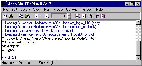 ModelSim is a very powerful and versatile HDL simulation tool which has been tightly integrated with Renoir. As a result, there are several methods by which we could go about verifying our design ranging from loading the bare design unit into the simulator and watching the outputs as we force the input signals into different states to creating a VHDL Test Bench which will automate this process for us. For our introduction to ModelSim, we will be using the first approach to get a feel for some of what the simulator can do.