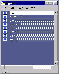 Looking at the Signals window, you can see that all of the ports and internal signals for the Logical sub-block are present. Since the simulator has not yet un forward in time, they are all currently in an undefined state.