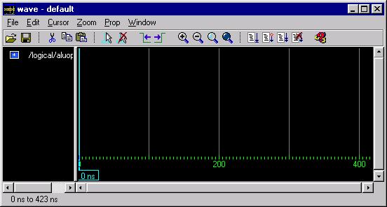 Begin by selecting the ALUOp signal in the Signals window by left-clicking over it. Once you have selected it, left-click again and this time hold the mouse button down. While the mouse button remains depressed, drag the pointer over to the Waves window and release. The Waves window should now look like Figure 5.
