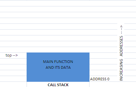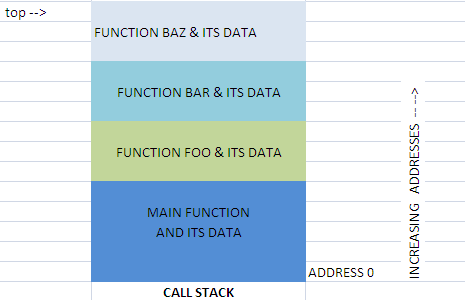 We now look at the mechanism by which the space used by a function is allocated when it is called and then deallocated when that function returns. For our purposes we will illustrate the concepts in a very simplified manner, omitting details of representation that may differ from OS to OS or compiler. We start with the call stack.