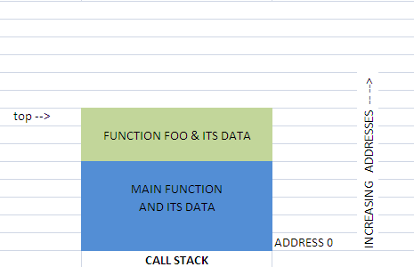 main calls foo() and foo's stack frame is pushed onto the stack and the top of the stack is advanced to the end of foo's frame.