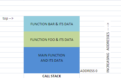 foo() calls bar() and bar's stack frame is pushed onto the stack and the top of the stack is incremented.