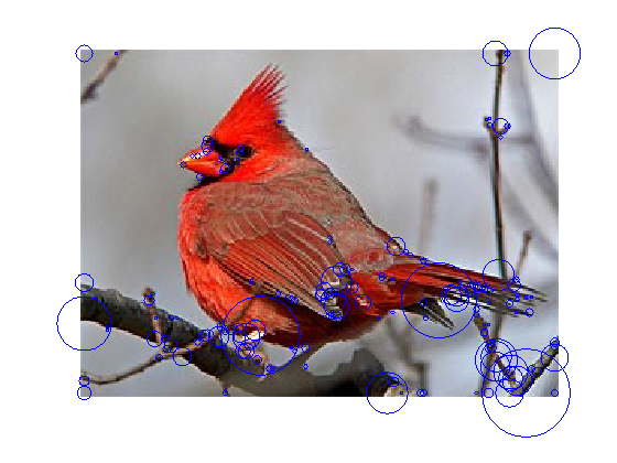- [10 pts] Show your detected keypoints on three images. For each image, display the image and visualize the keypoints you have detected on it, for example by drawing a circle for each keypoint. Use the scores variable and make keypoints with higher scores correspond to larger circles, e.g. plot(x(i), y(i), 'ro', 'MarkerSize', scores(i) / 1000000000); (You don't have to divide by this value exactly.) Name your visualizations vis1.png, vis2.png, vis3.png. Here is a sample of keypoints that you might get on an image of a cardinal.