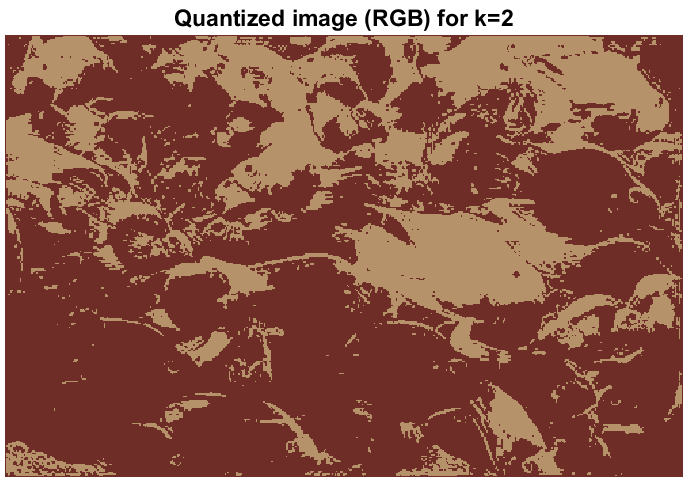 [15 pts] function [outputImg, meanColors, clusterIds] = quantizeRGB(origImg, k) which performs clustering in the 3-dimensional RGB space, and "quantizes" the image. Use the built-in Matlab function kmeans (and read the documentation to see how to use it). At the end of your function, show the (1) original and (2) quantized image, in a 1x2 subplot. Make sure to label the figure with the value of k that was used.