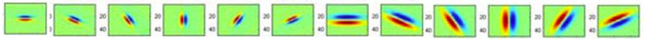 - Suppose we form a texture description using a filter bank at two scales and six orientations like the one below. If we rotate Image A by an arbitrary degree (resulting in Image B) and compute the responses to the filters, would the sequence of responses be the same as if we hadn't rotated the image? Why/why not? Then, suppose we compute the mean response of Images A and B to each filter, resulting in a 12x1 feature/descriptor for each image. What can you say about the distance between the two descriptors (for A and B), e.g. would it be 0? If the descriptor is not invariant to rotation, how can we formulate a descriptor that may be invariant to rotation? (Question based on an assignment by Kristen Grauman.)